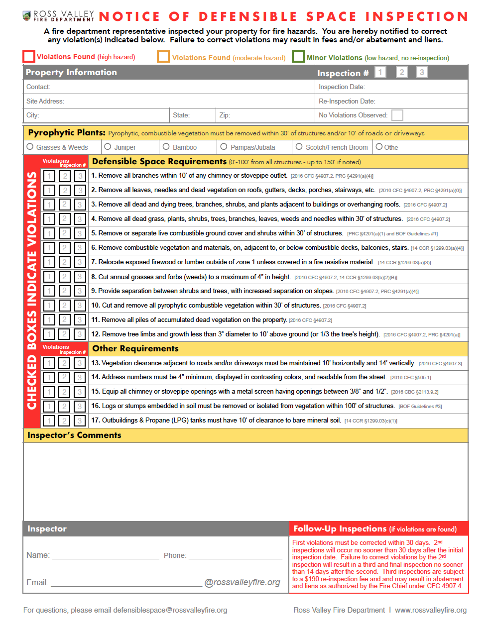 - Initial follow up inspections will occur no sooner than 30 days after the first inspection. We do not have the staffing available to arrange individual inspection appointments for all property owners. Please contact the inspector who signed your form with questions about your property, or email defensiblespace@rossvalleyfire.org is no contact info is listed. Inspectors will verify that the work is completed and ensure no new hazards are present.