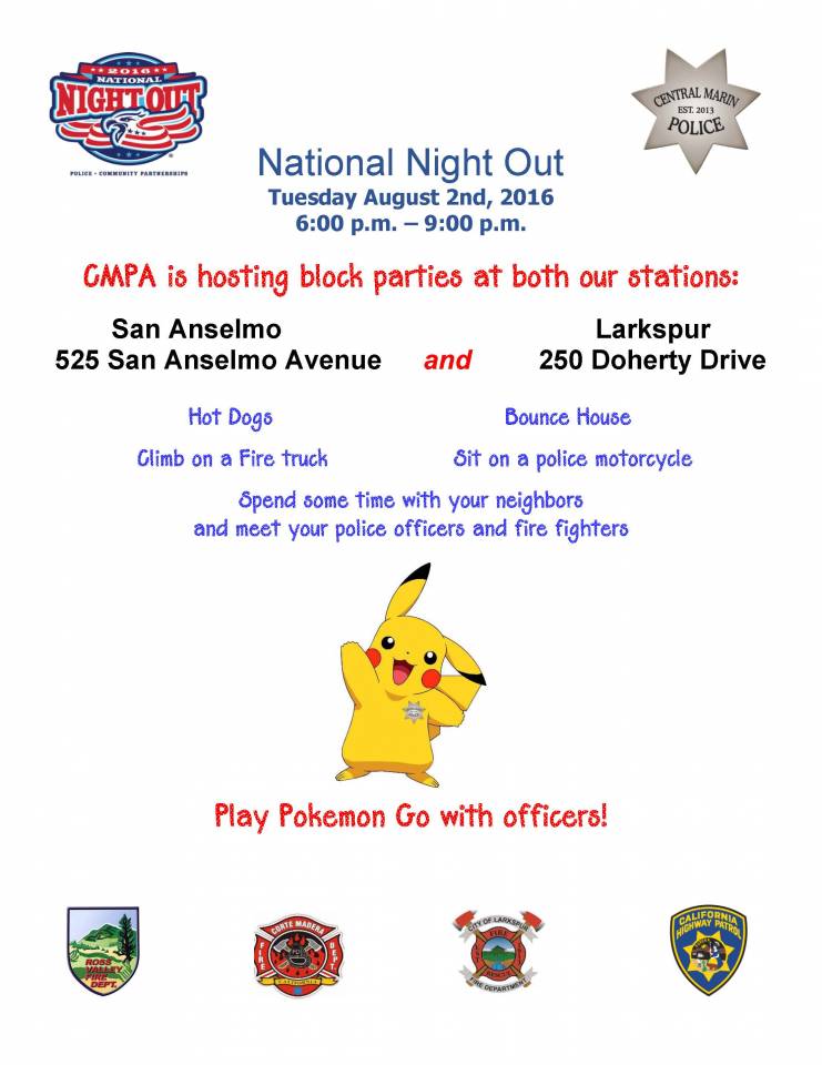 While the traditional “lights on” and front porch vigils remain a part of NNO, activities have expanded considerably over the years. Neighborhood events can be casual and informal such as a potluck or ice cream social, or more elaborate activities like a street party. If your neighborhood is not able to hold an event this year, then please come on over to our house! CMPA will host block parties at both our stations: in Larkspur at 250 Doherty Drive, and in San Anselmo at 525 San Anselmo Avenue. This is a night to send a powerful message about neighborhood unity, awareness, safety, and police-community partnerships. Let criminals know that we are united and dedicated to building safer, more caring communities.